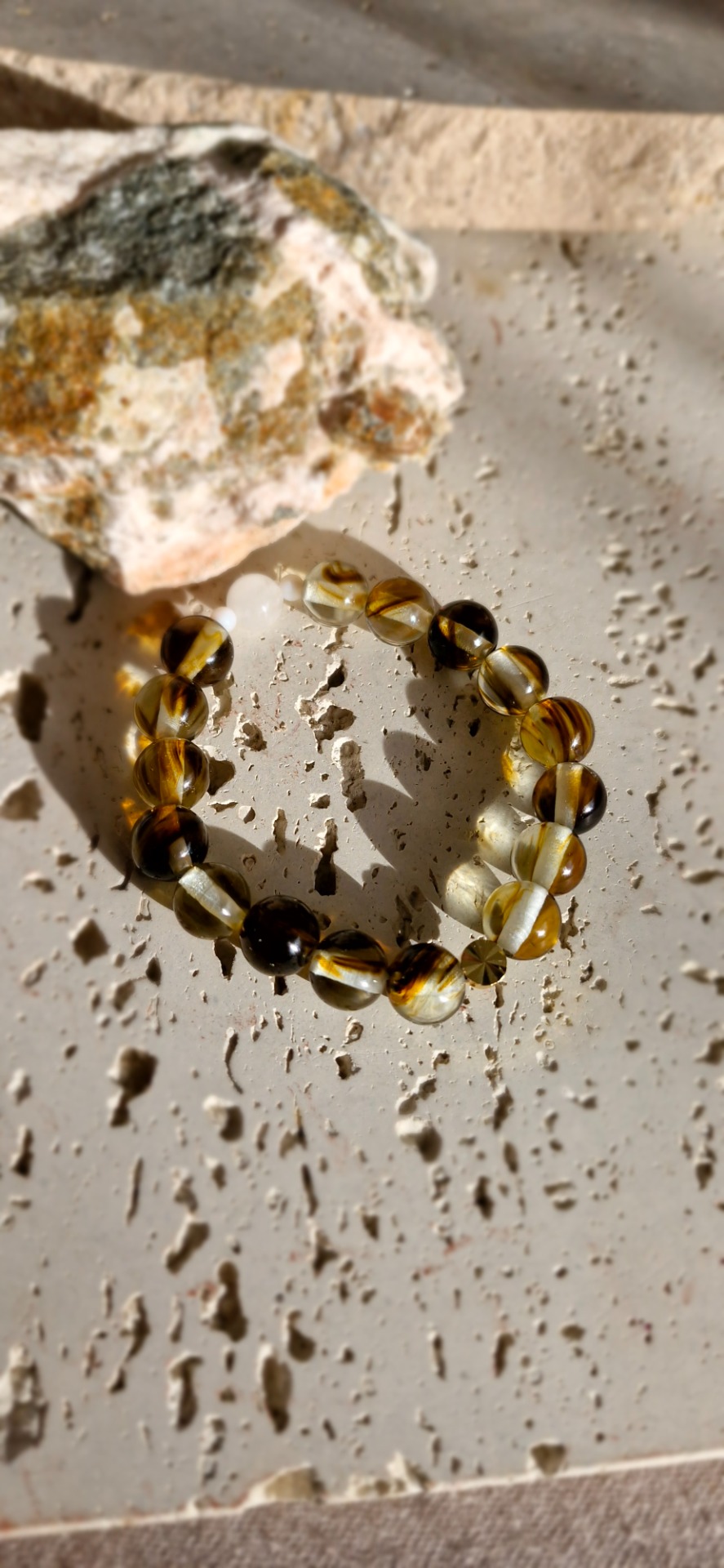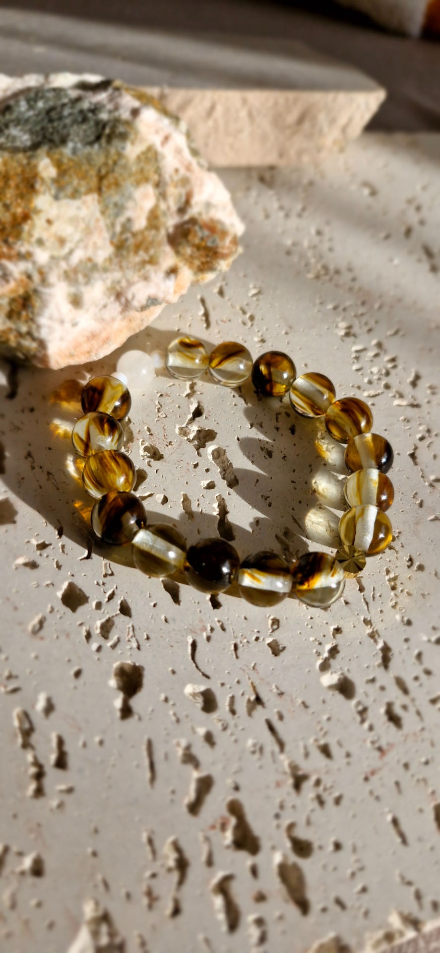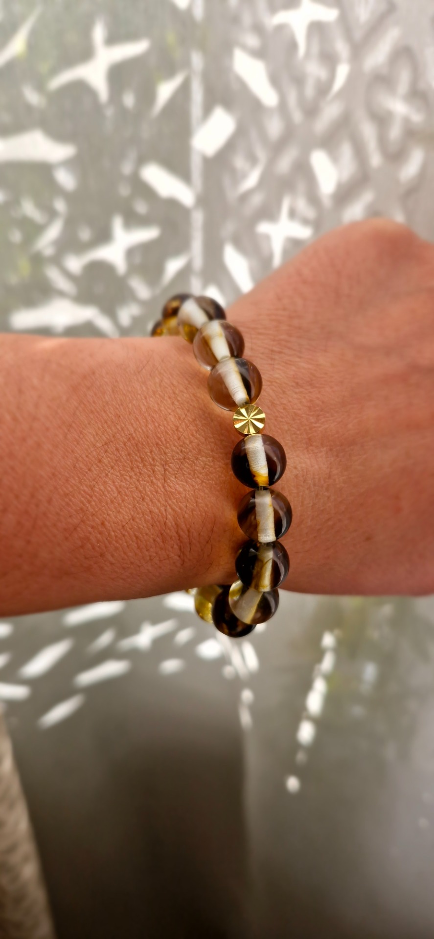 Prekrásny náramok tvoria korálky z 10mm ANDARIEK čírych s prímesou hnedej s tým najkrajším žiarivým odleskom.