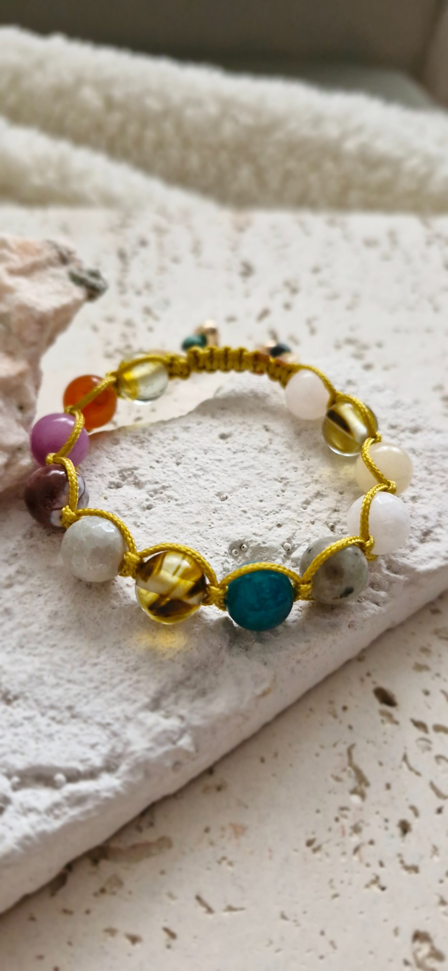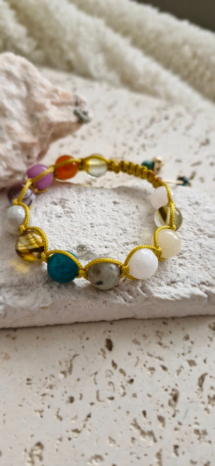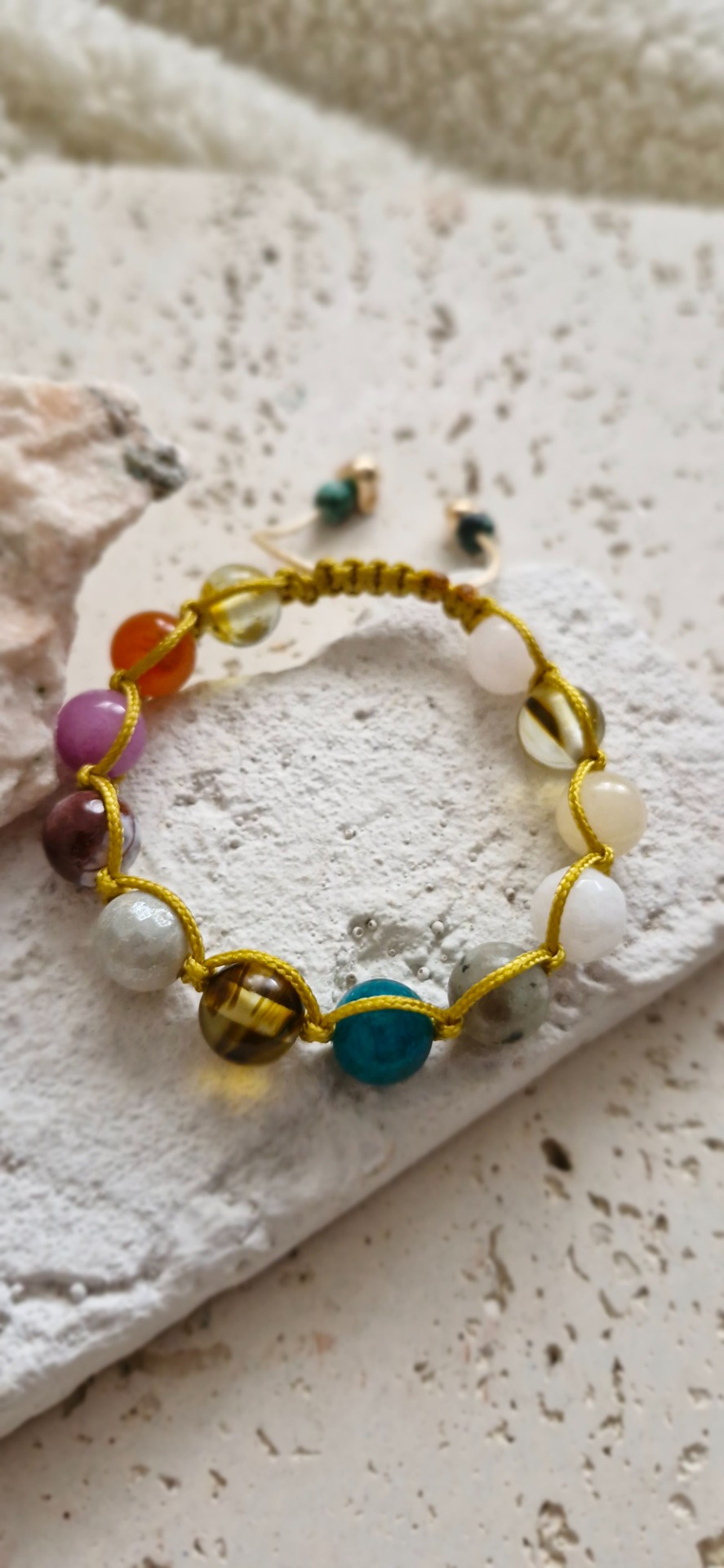 Ručne prepletený saténovou šnúrkou, náramok je pohodlný na nosenie a nastaviteľný, takže sa prispôsobí každému zápästiu. Ideálny ako osobný talizman alebo elegantný doplnok s hlbokým významom.