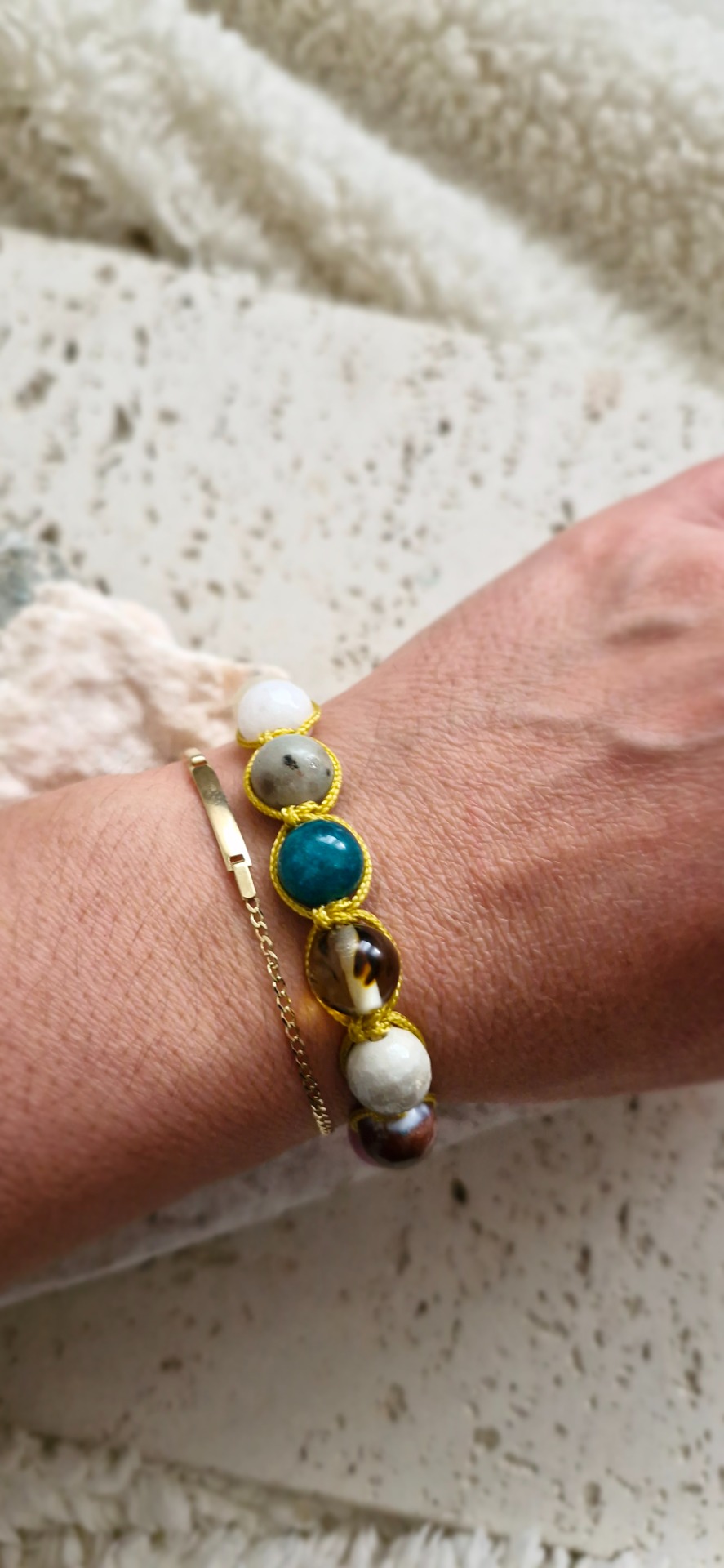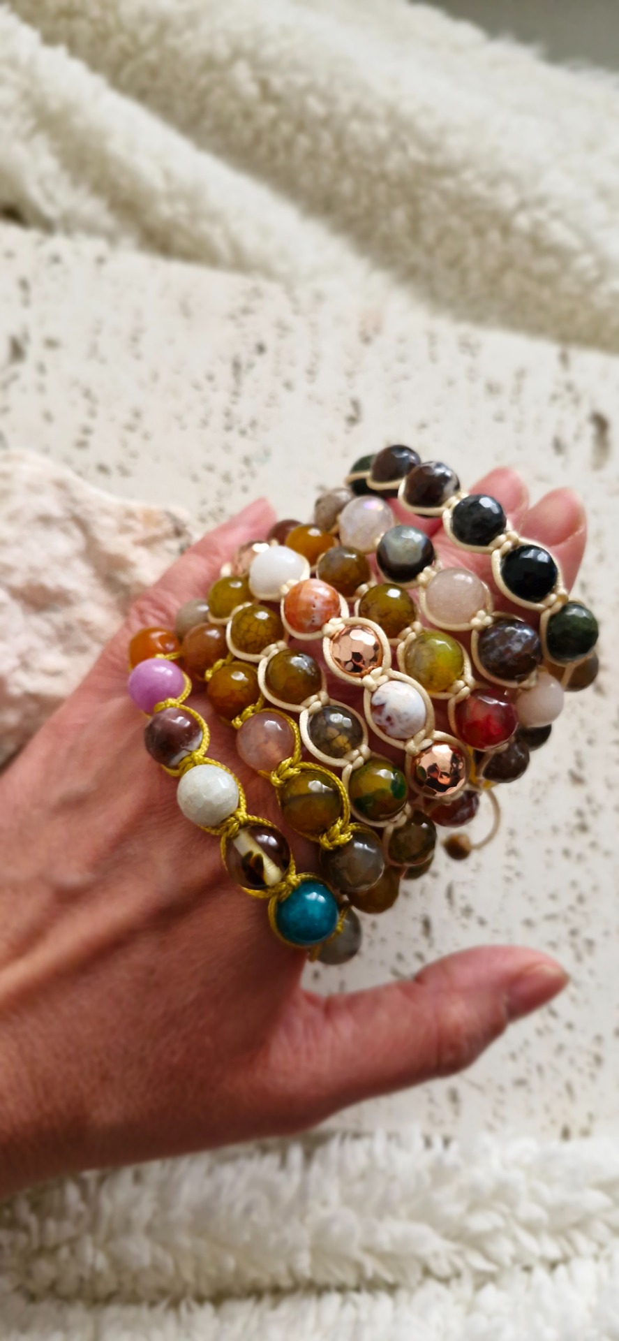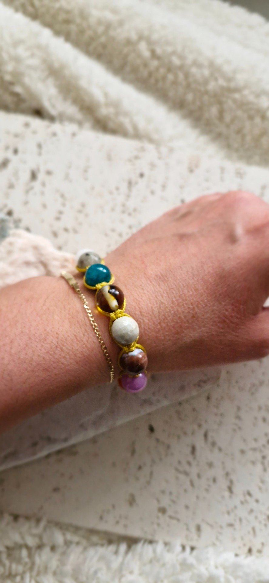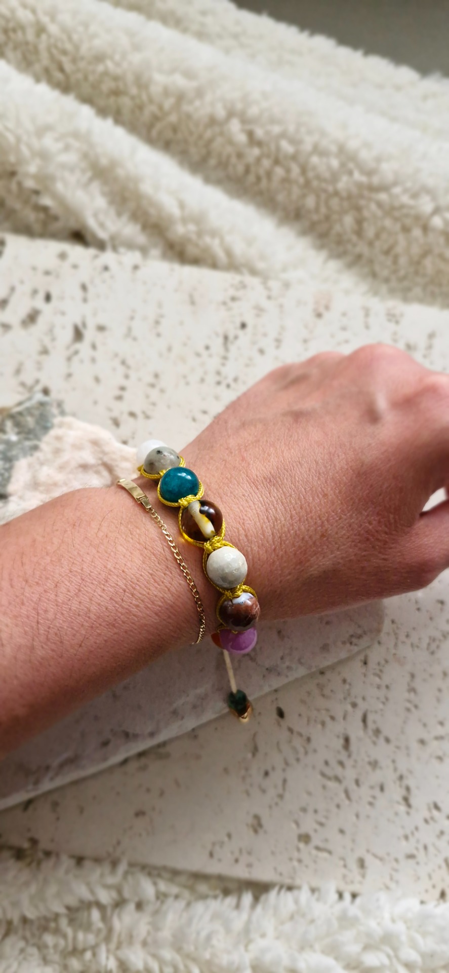 Ručne prepletený saténovou šnúrkou, náramok je pohodlný na nosenie a nastaviteľný, takže sa prispôsobí každému zápästiu. Ideálny ako osobný talizman alebo elegantný doplnok s hlbokým významom.