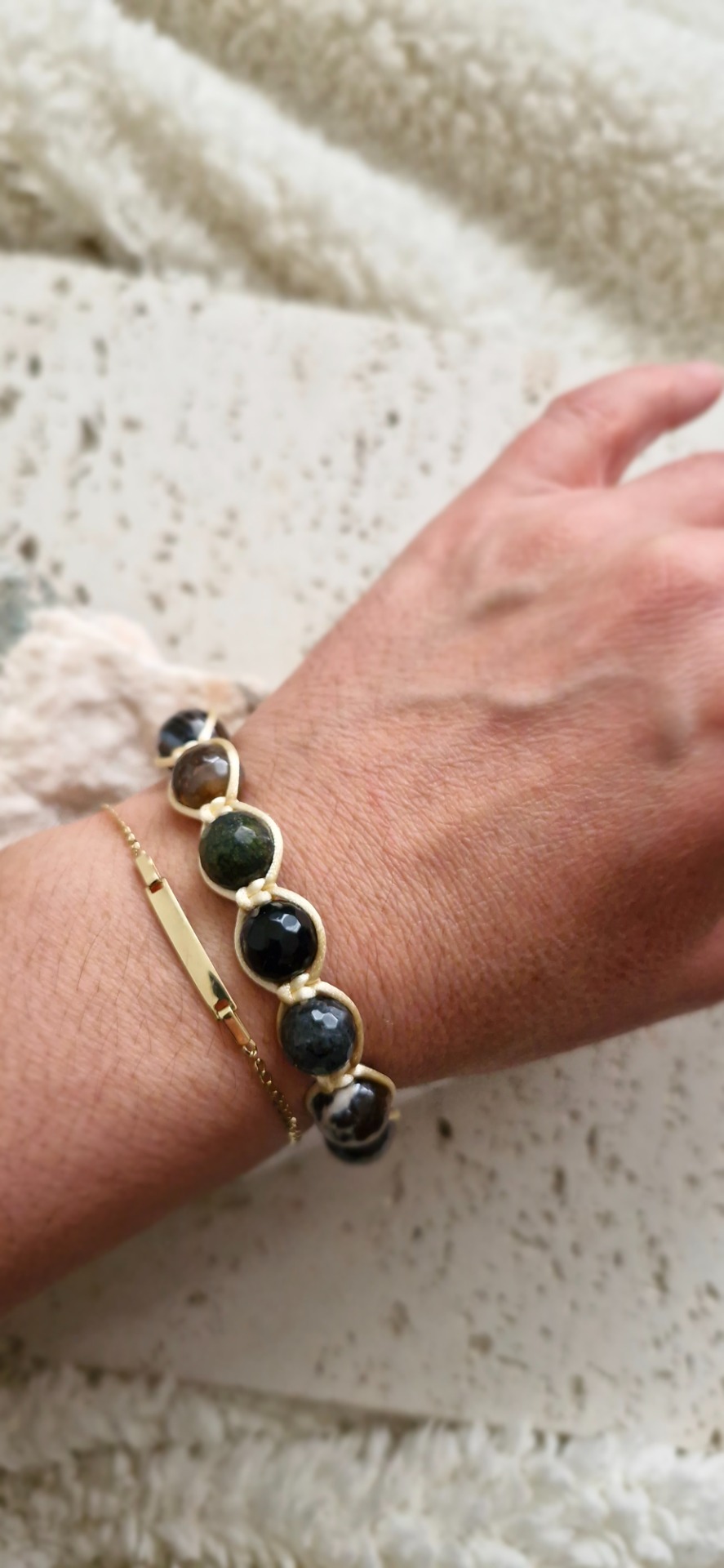 Náramok z minerálov serpentinit a achát prináša energiu uzemnenia, ochrany a vnútorného pokoja. Serpentinit podporuje vnútornú silu a vyrovnanosť, zatiaľ čo achát stabilitu a ochrannú vibráciu.