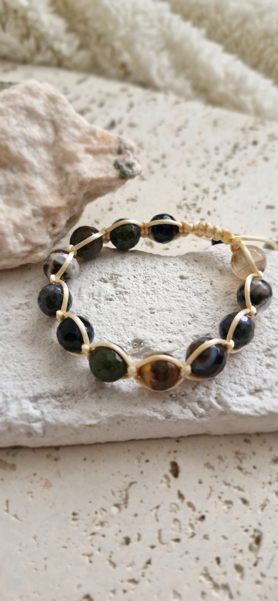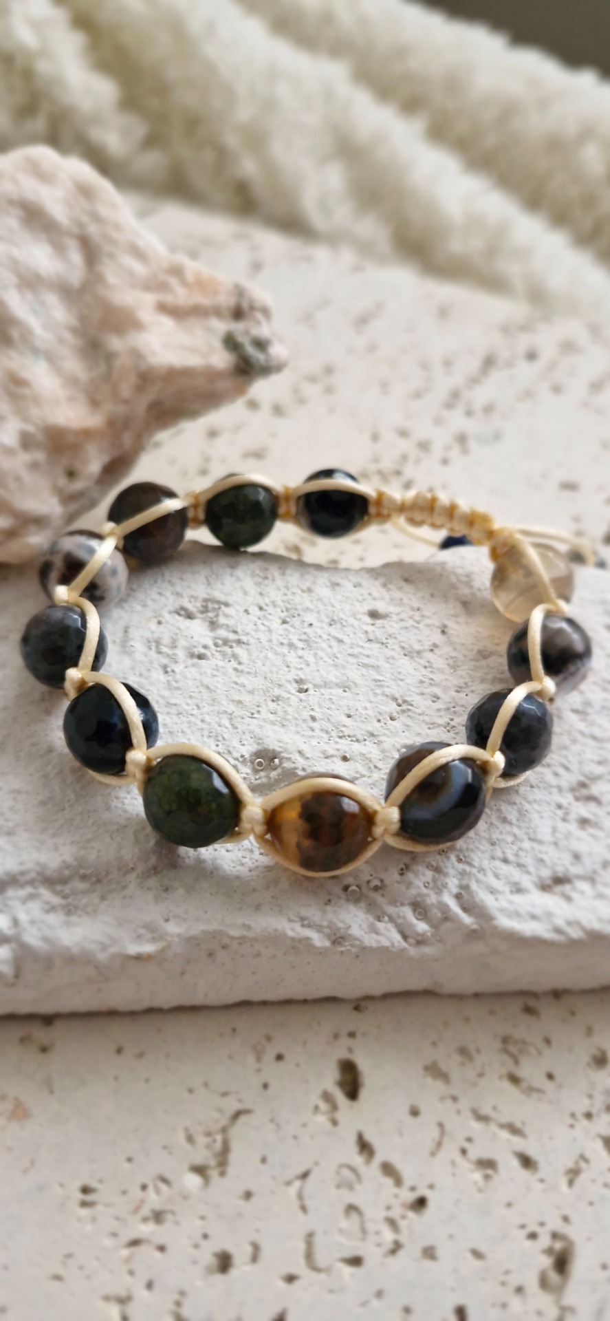 Ručne prepletený saténovou šnúrkou, náramok je pohodlný na nosenie a nastaviteľný, prispôsobí sa každému zápästiu. Ideálny ako osobný talizman alebo nenápadný, no silný doplnok.