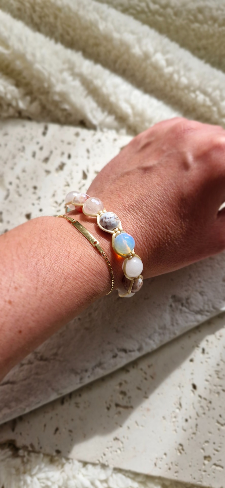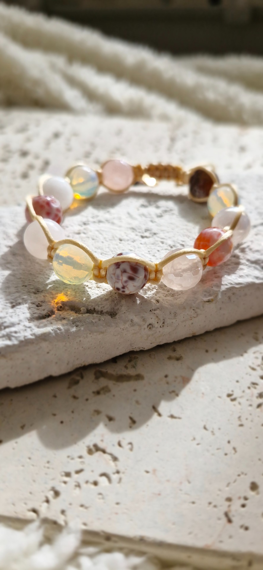 Náramok je ručne prepletený saténovou šnúrkou, vďaka čomu je príjemný na nosenie a prispôsobí sa každému zápästiu – má nastaviteľnú veľkosť. Ideálny ako osobný talizman alebo darček s hlbším významom.