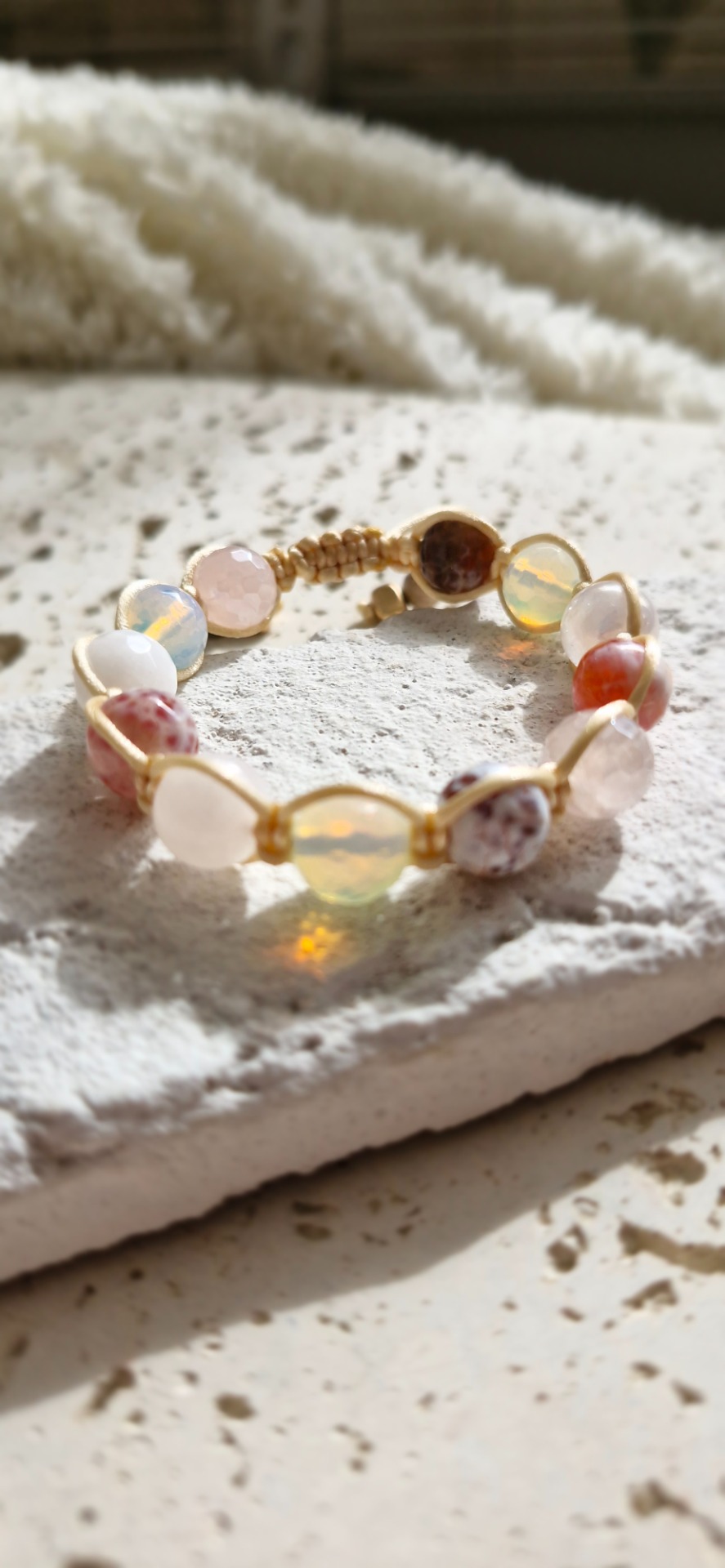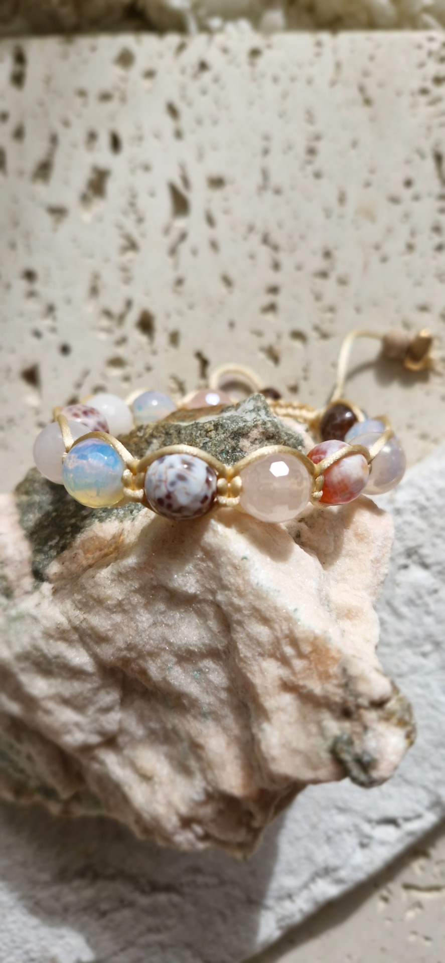 Jemný náramok z minerálov-koralok AAA kvality, jadeit, ohnivý achát, ruženín a aqua aura je vytvorený ako harmonická kombinácia energie pokoja, vitality a lásky. Každý kameň v sebe nesie jedinečnú vibráciu, ktorá podporuje vnútornú rovnováhu a ženskú silu.
