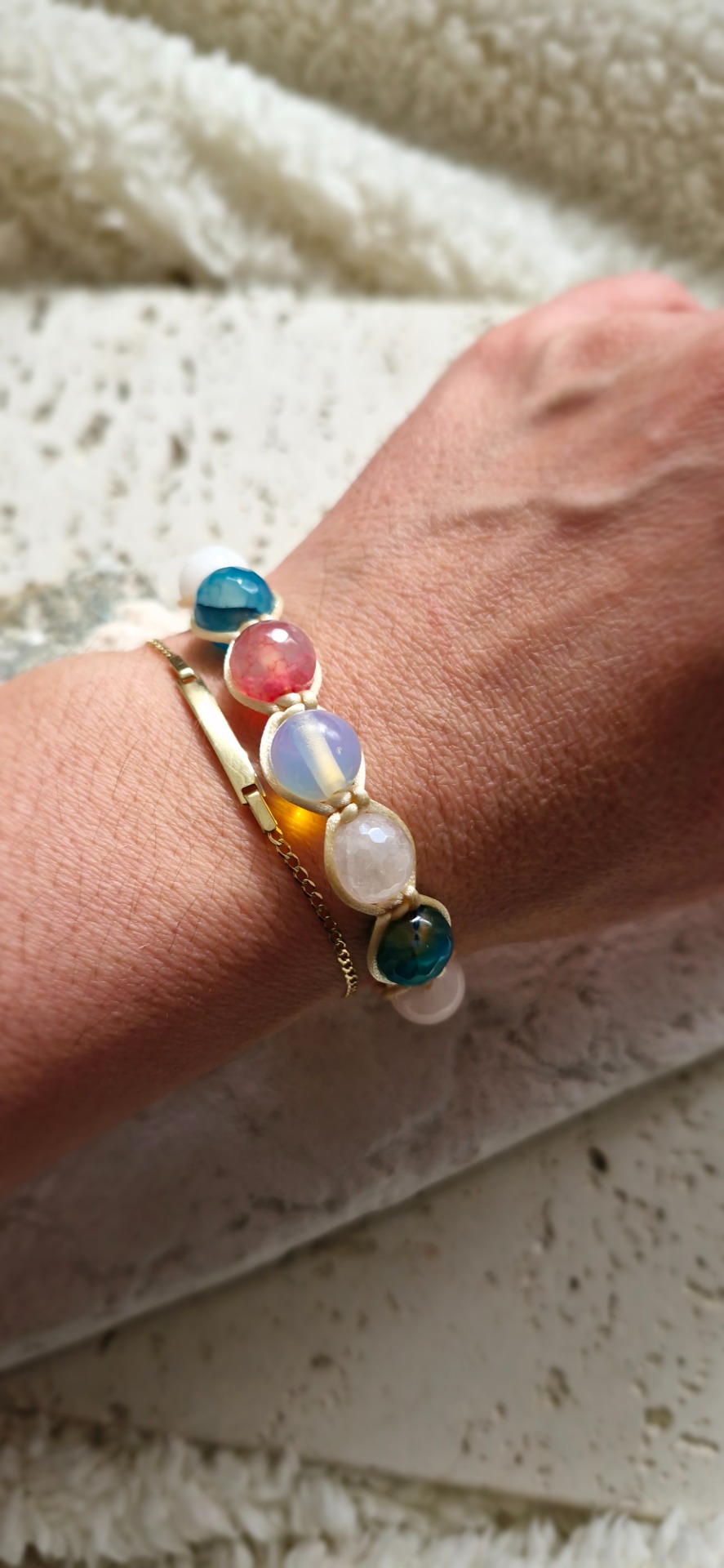 Náramok z minerálov jadeit, opalit a achát spája energiu pokoja, jemnej ochrany a vnútorného vyrovnania. Každý kameň prináša svoju jedinečnú vibráciu – jadeit podporuje harmóniu, opalit citlivosť a očistenie, achát stabilitu a uzemnenie.