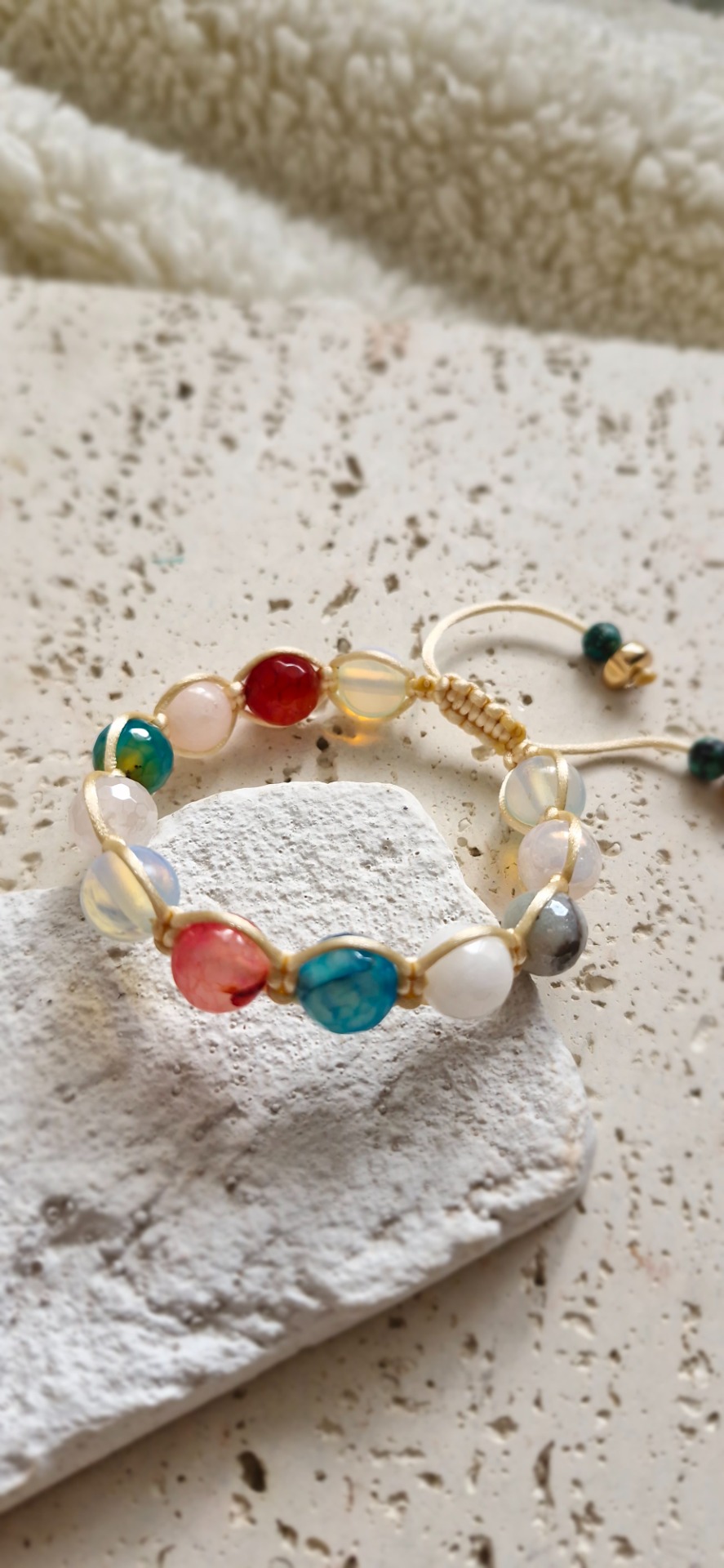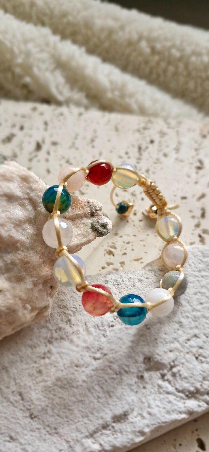 Ručne prepletený saténovou šnúrkou, náramok je pohodlný na nosenie a nastaviteľný, takže sa prispôsobí každému zápästiu. Skvelý ako osobný talizman alebo elegantný doplnok s významom.