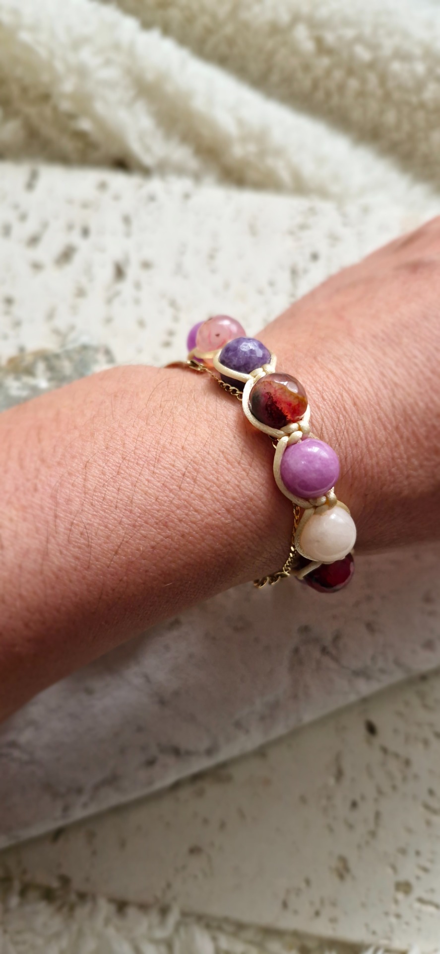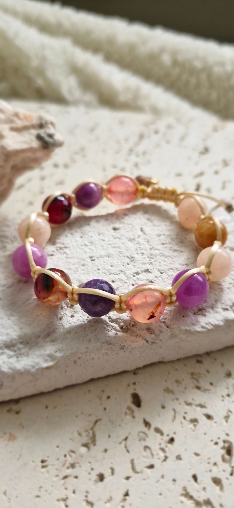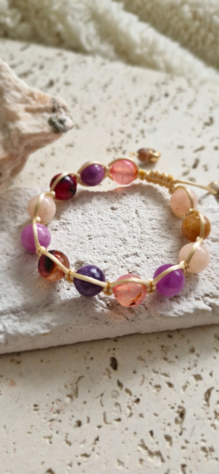 Náramok je ručne prepletený saténovou šnúrkou, vďaka čomu je pohodlný na nosenie a prispôsobí sa každému zápästiu – má nastaviteľnú veľkosť. Ideálny ako nenápadný, no silný talizman na každý deň.
