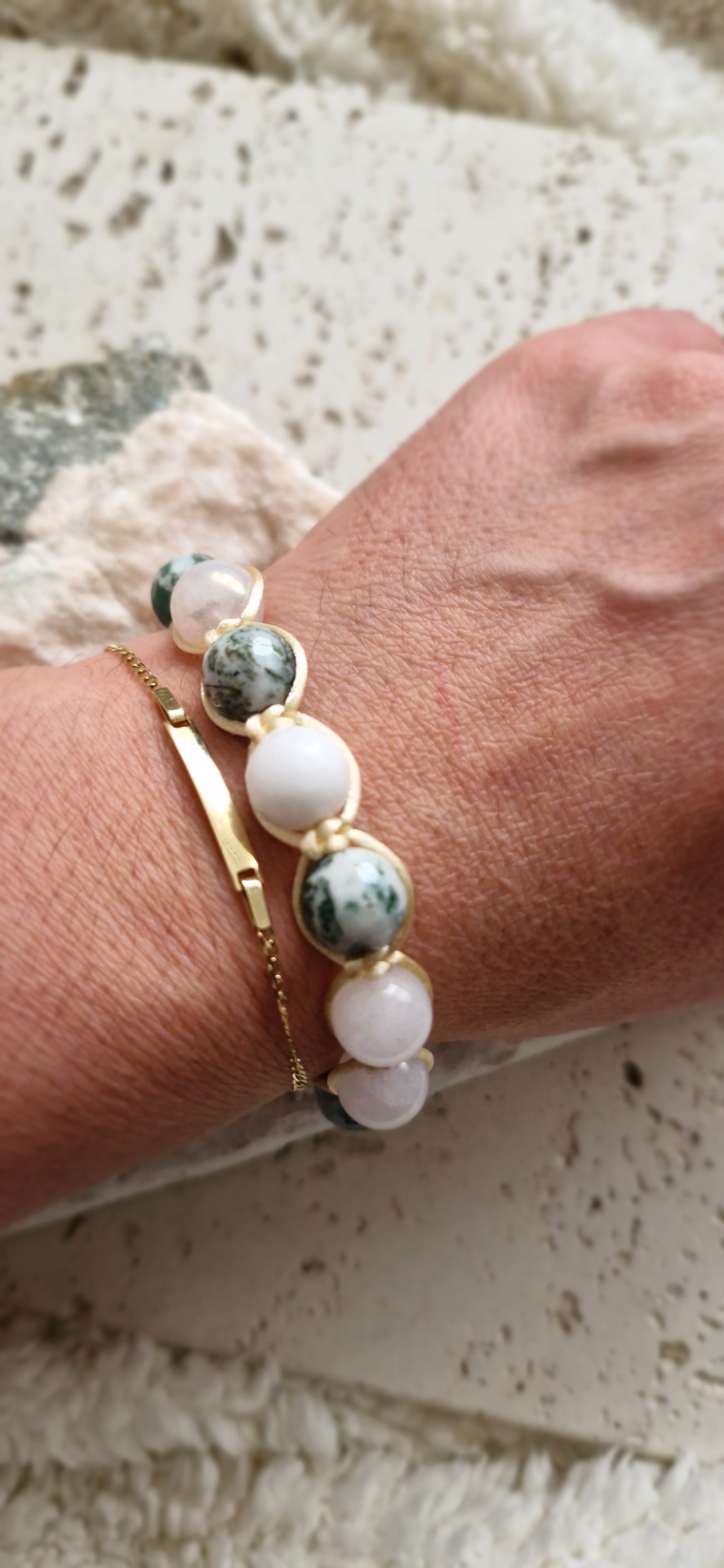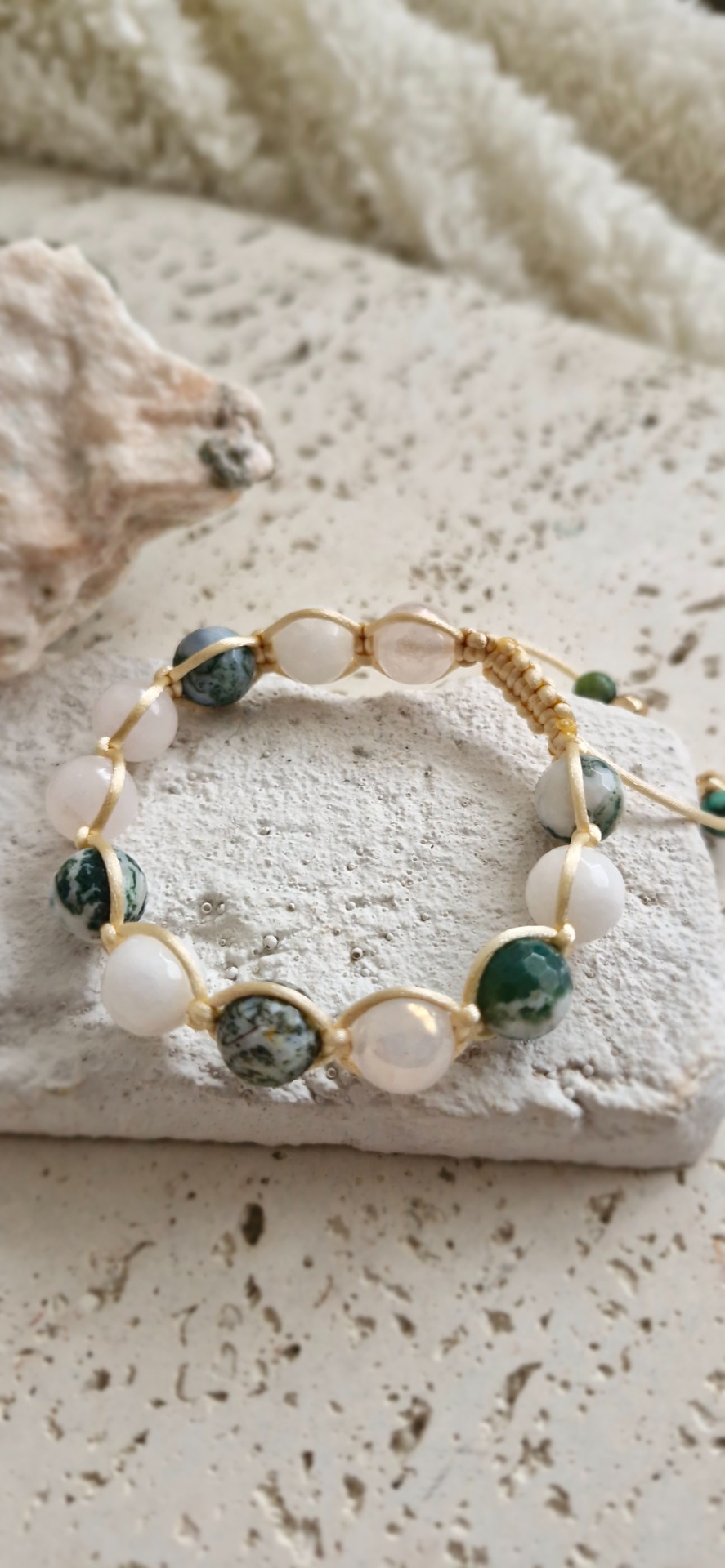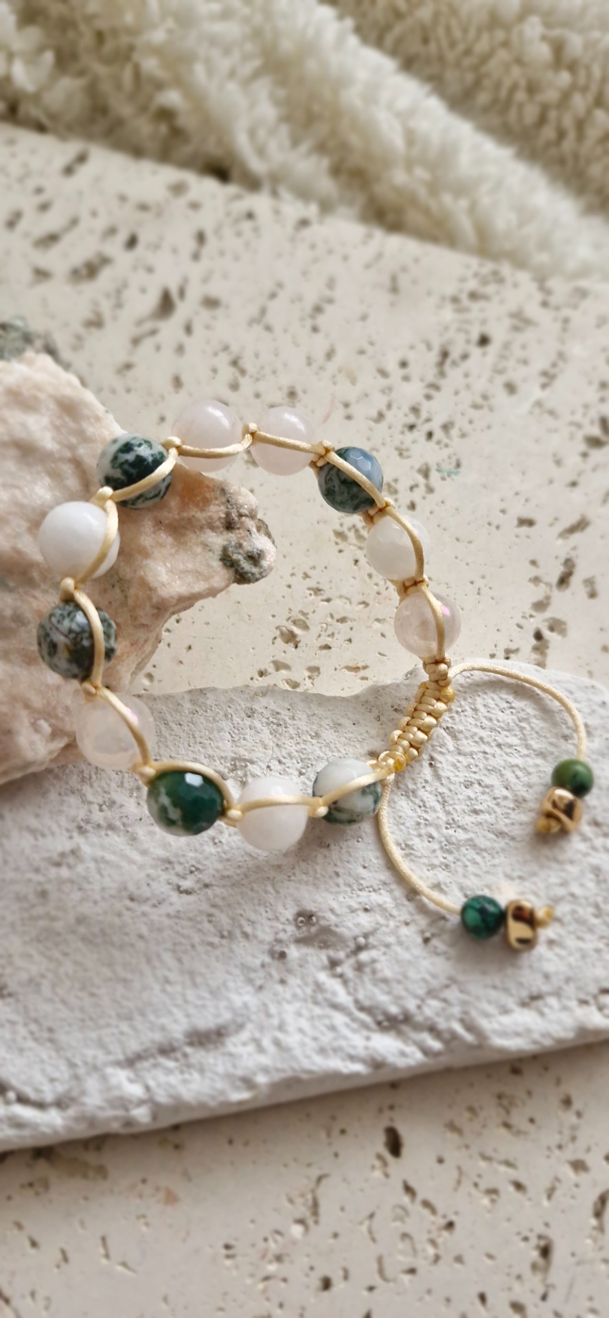 Náramok z minerálov achát, jadeit, ruženín a fazetovanej aqua aury spája stabilitu, harmóniu a jemnú energiu lásky s ochrannou svetelnou vibráciou. Achát prináša uzemnenie, jadeit rovnováhu, ruženín podporuje citlivosť a srdcovú energiu a aqua aura očisťuje a posilňuje pozitívnu náladu.