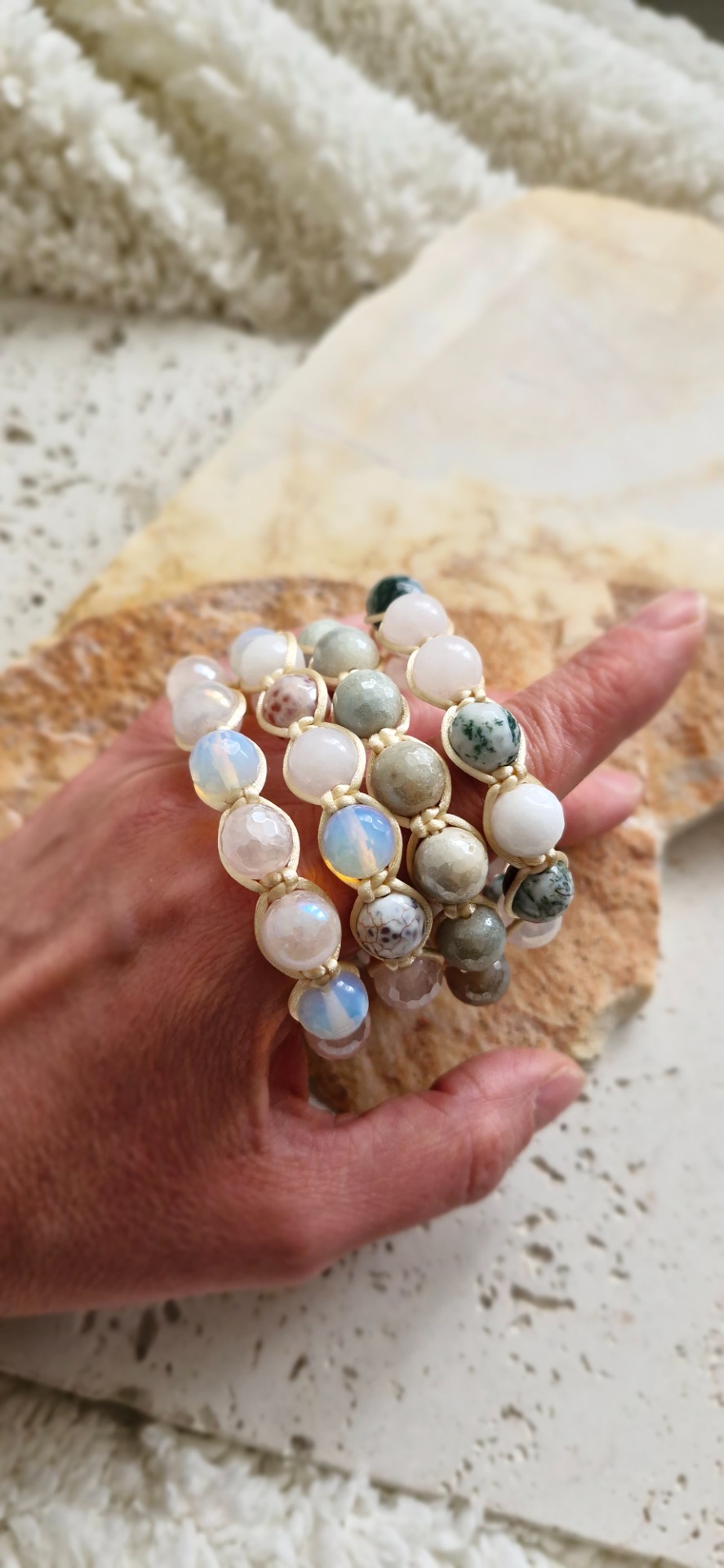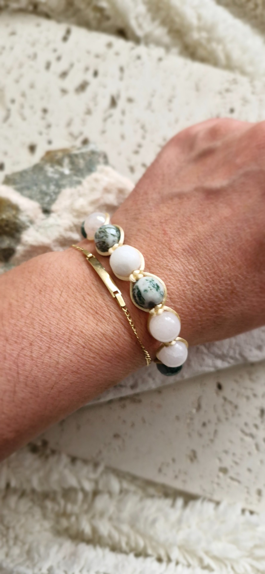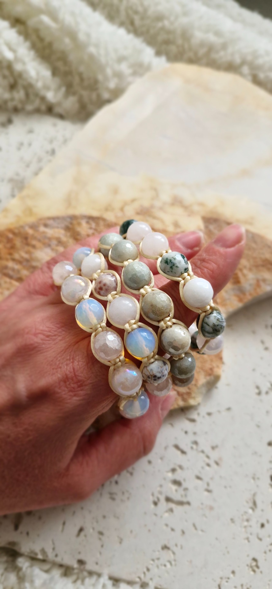 Náramok z minerálov achát, jadeit, ruženín a fazetovanej aqua aury spája stabilitu, harmóniu a jemnú energiu lásky s ochrannou svetelnou vibráciou. Achát prináša uzemnenie, jadeit rovnováhu, ruženín podporuje citlivosť a srdcovú energiu a aqua aura očisťuje a posilňuje pozitívnu náladu.