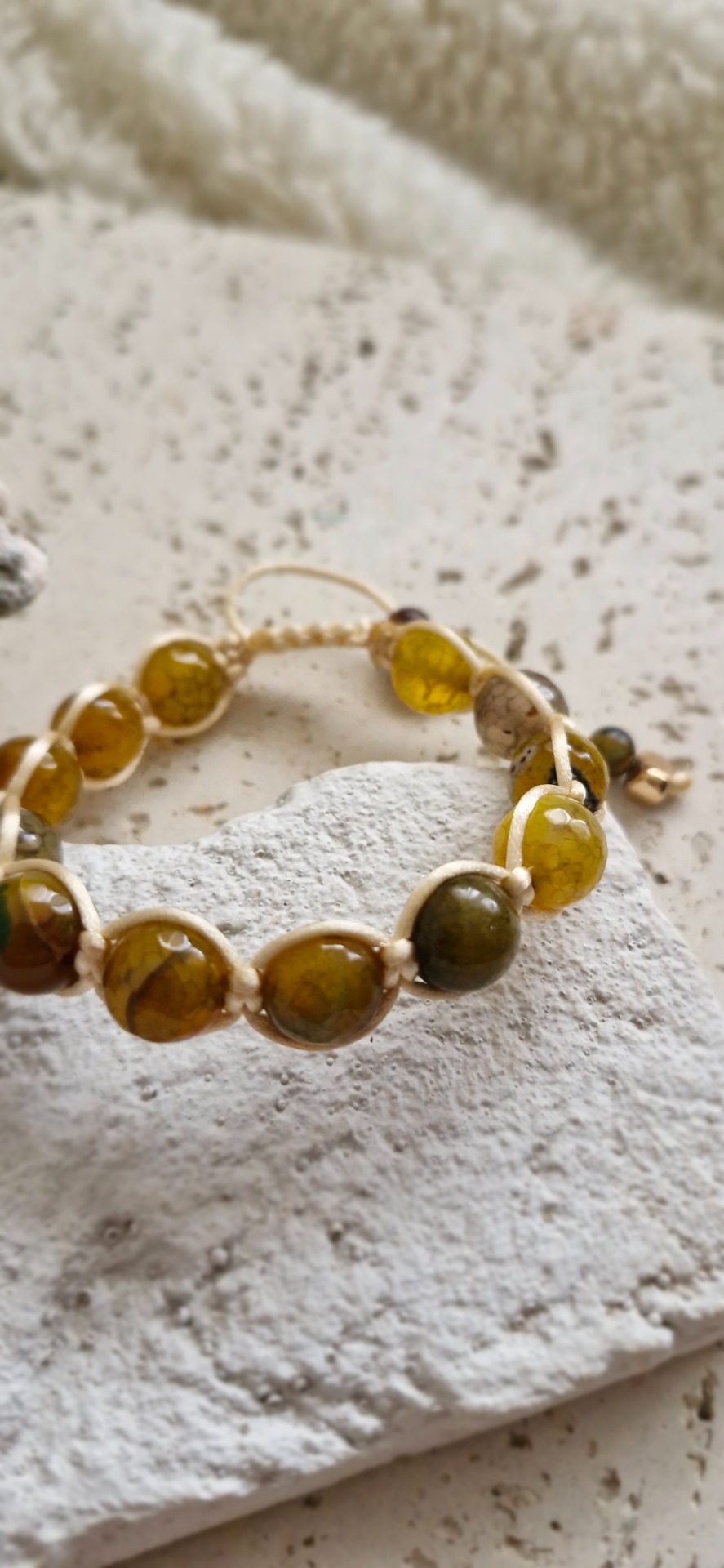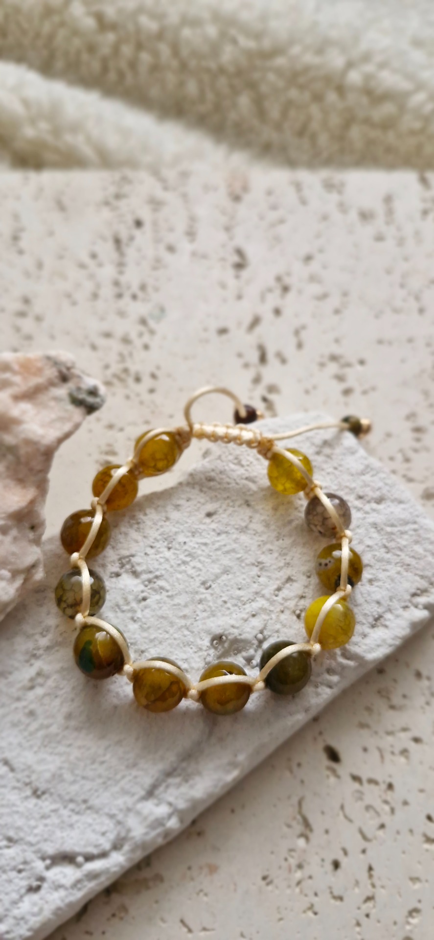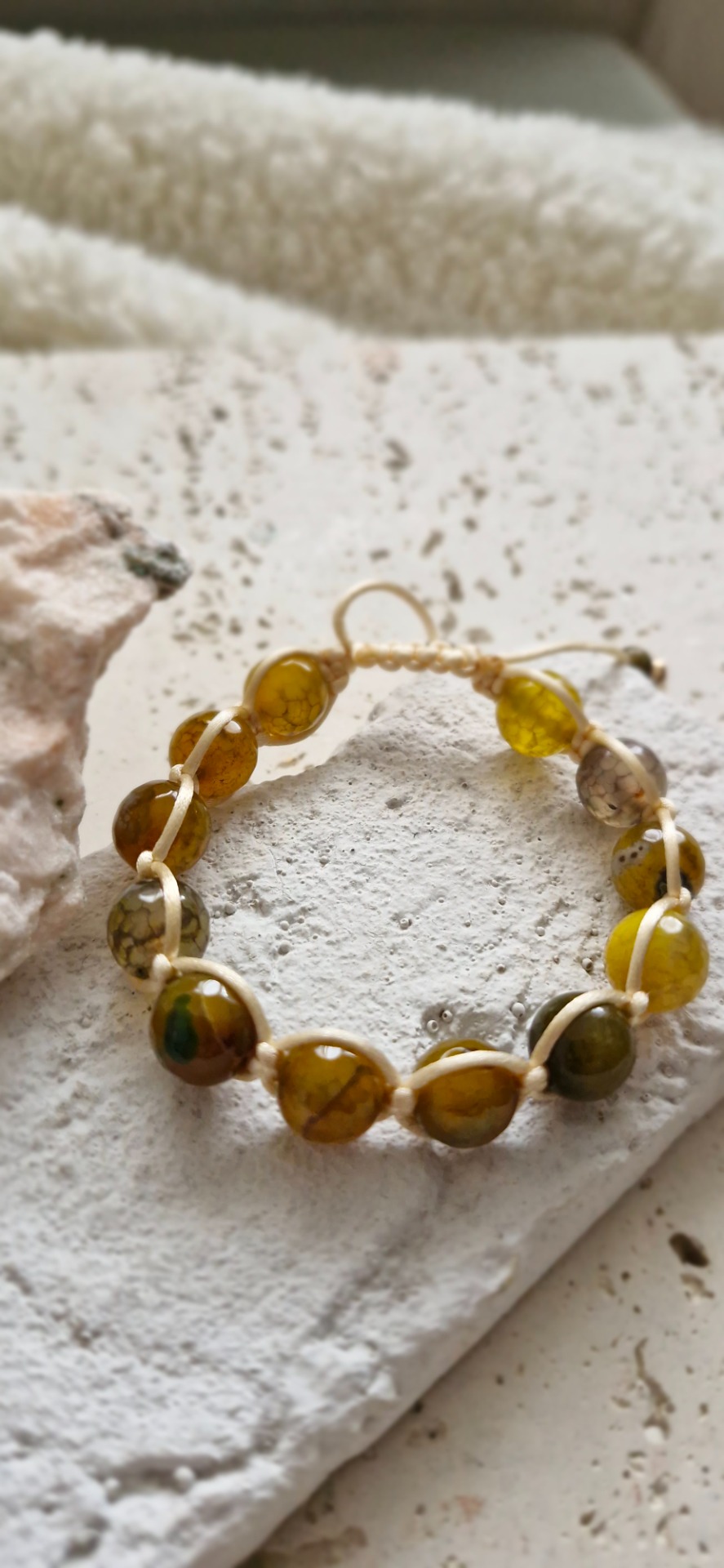 Náramok je ručne prepletený saténovou šnúrkou, vďaka čomu je pohodlný na nosenie a prispôsobí sa každému zápästiu – má nastaviteľnú veľkosť. Ideálny ako nenápadný, no silný talizman na každý deň.