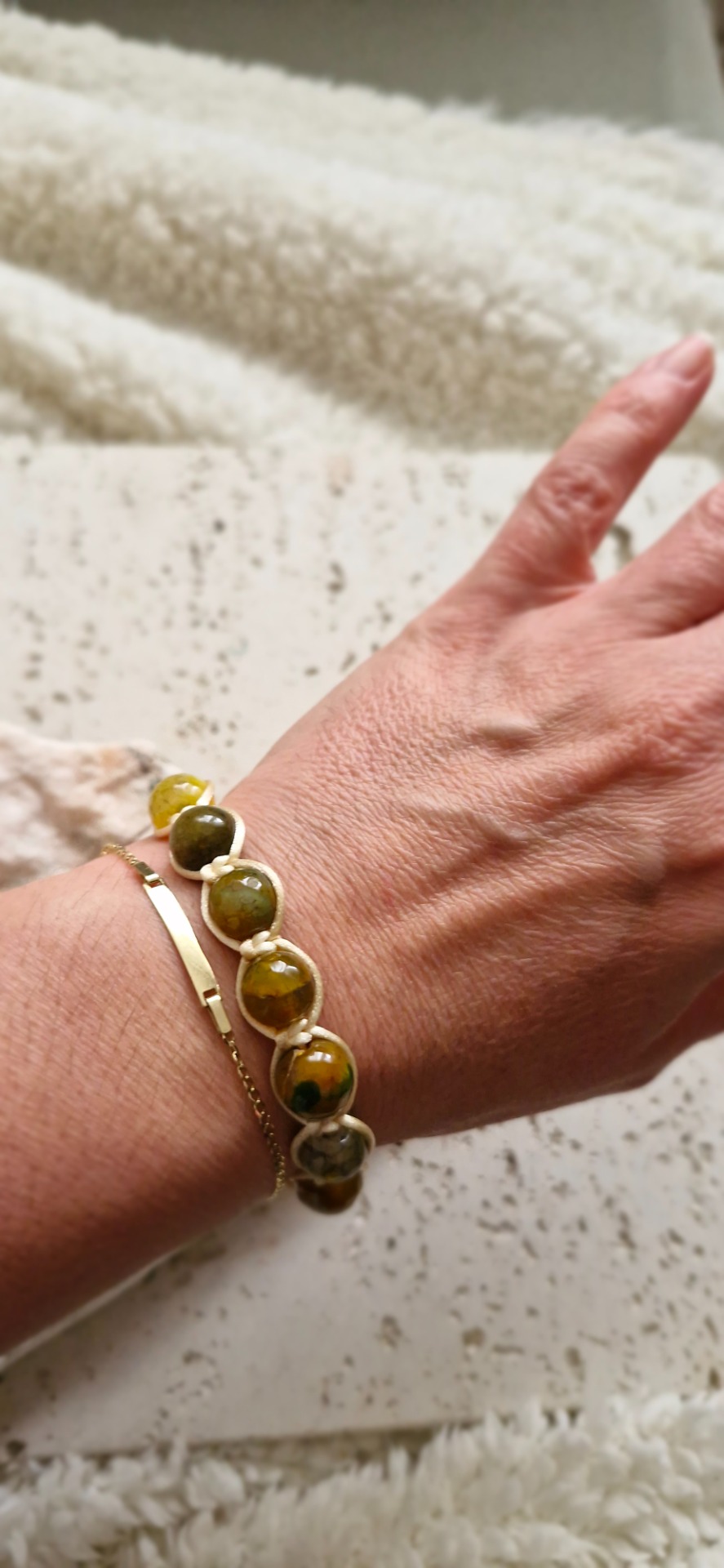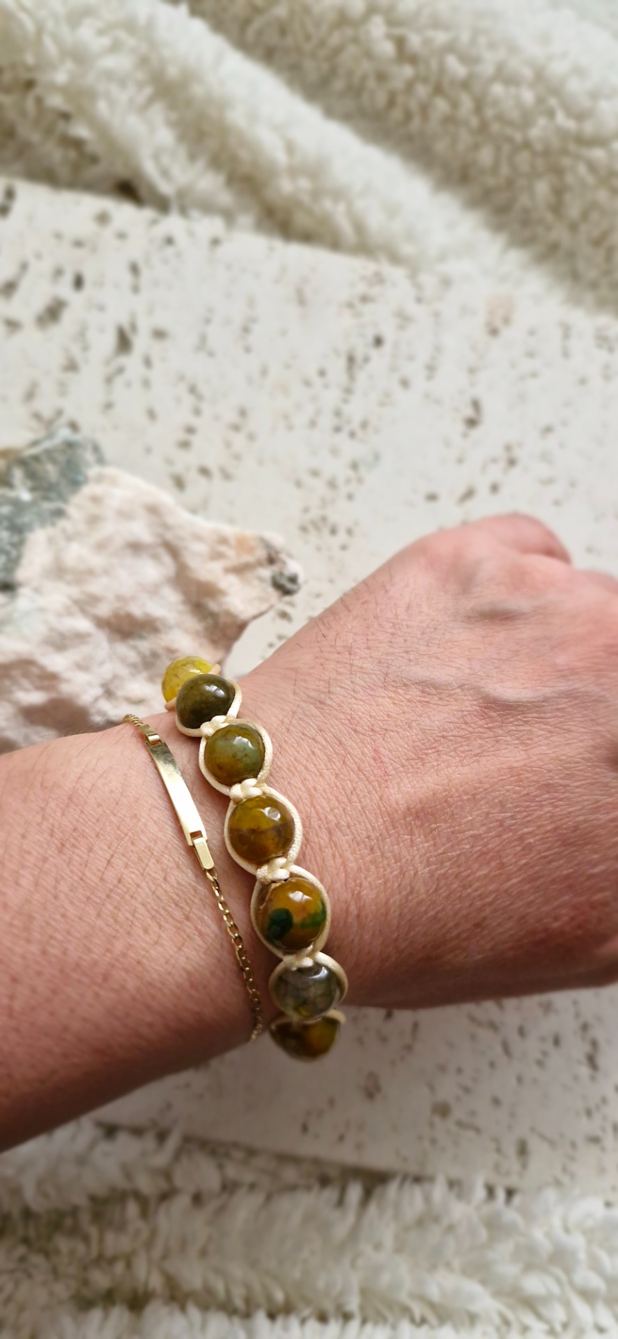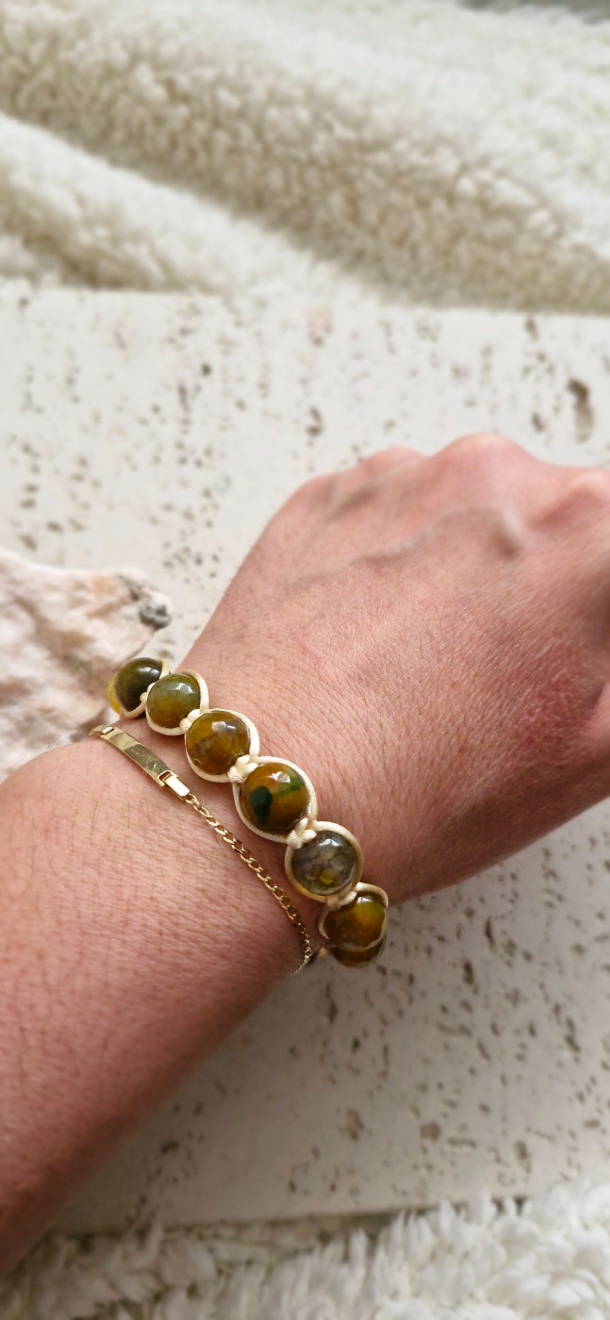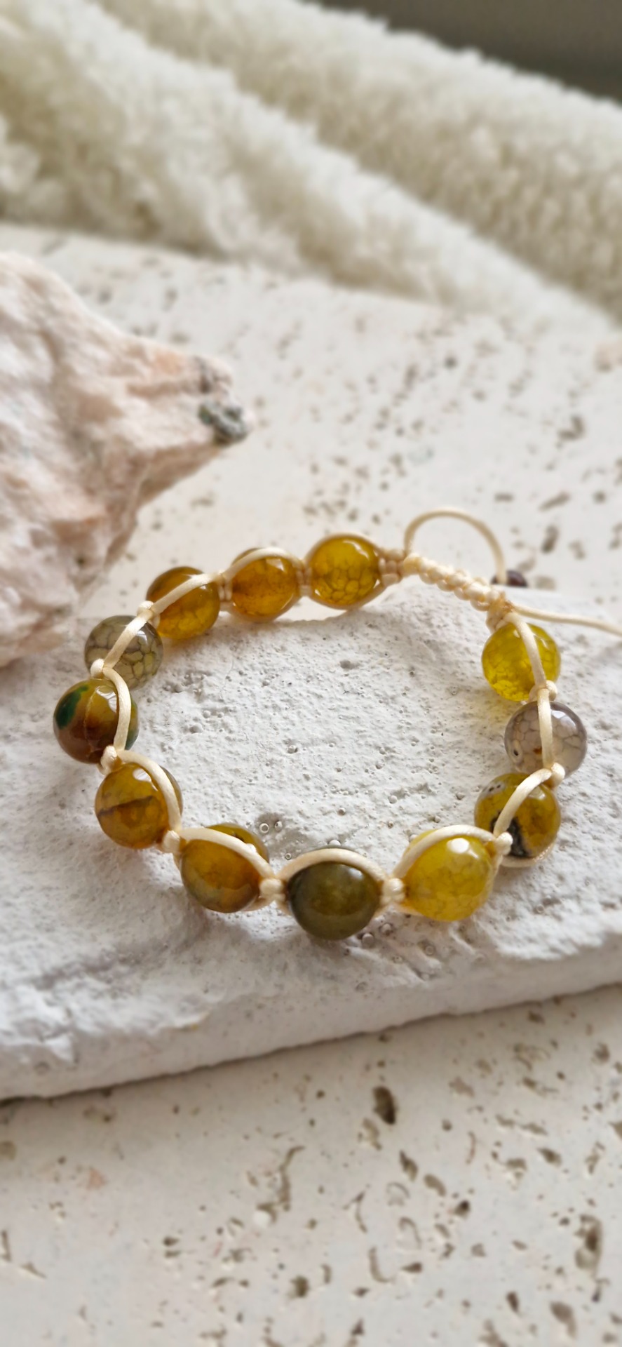Náramok je ručne prepletený saténovou šnúrkou, vďaka čomu je pohodlný na nosenie a prispôsobí sa každému zápästiu – má nastaviteľnú veľkosť. Ideálny ako nenápadný, no silný talizman na každý deň.