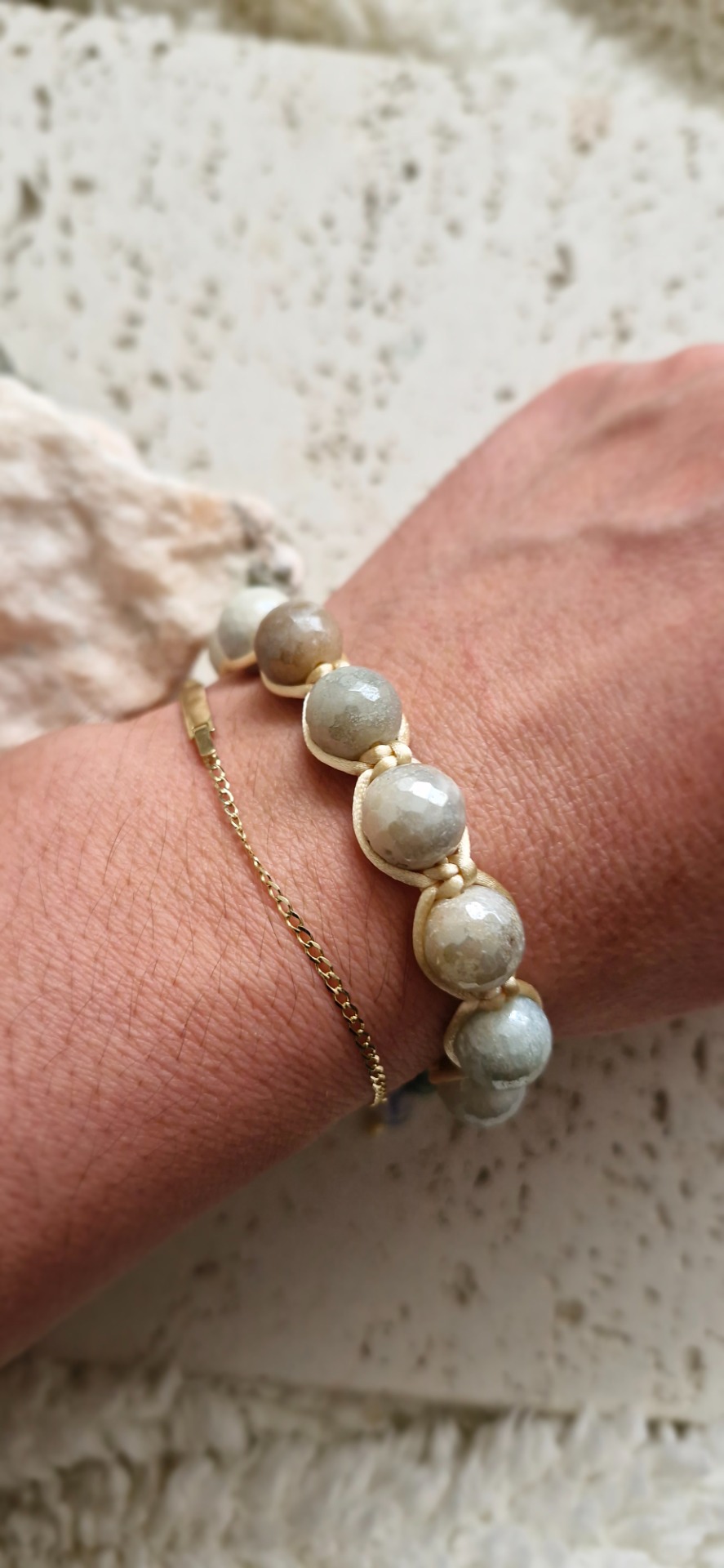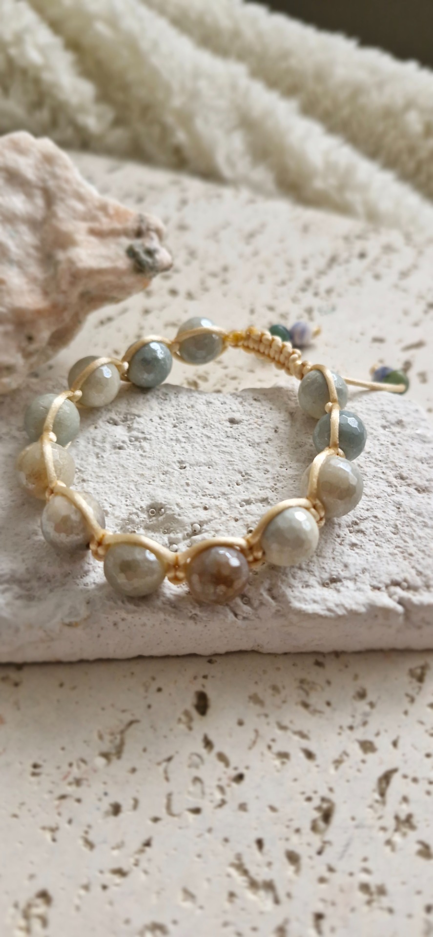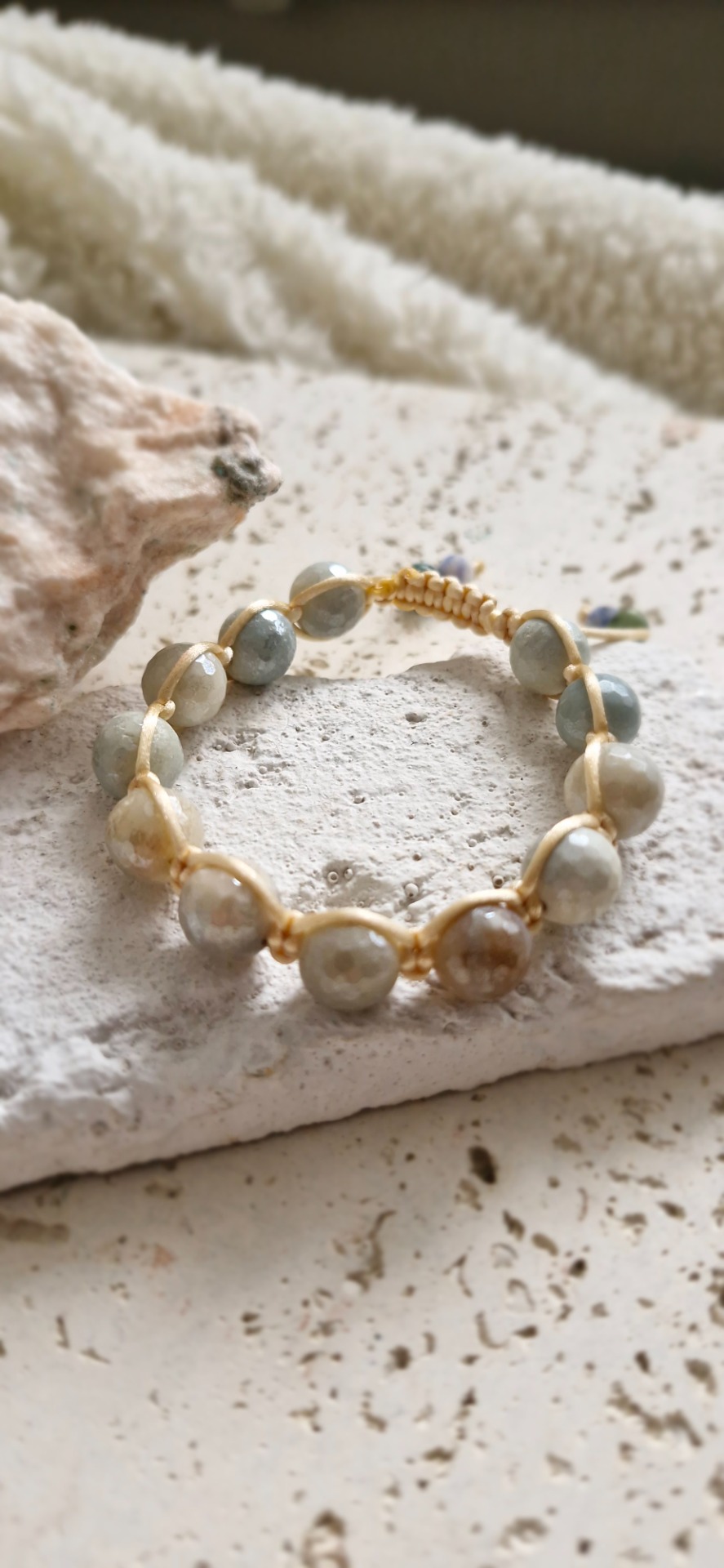 Ručne prepletený saténovou šnúrkou, náramok je pohodlný na nosenie a nastaviteľný, takže sa prispôsobí každému zápästiu. Ideálny ako osobný talizman alebo nenápadný doplnok s významom.